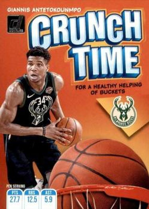 The Giannis Antetokounmpo 2019 Donruss #4 Crunch Time card is 1 of 55 Giannis Antetokounmpo's card variations in the 2019 Donruss set being tracked by Sports Card Investor, including Base, Green Flood, Green & Yellow Laser, Infinite, and Orange Laser.