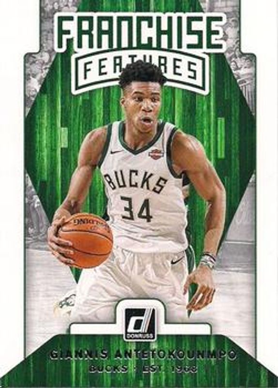 The Giannis Antetokounmpo 2019 Donruss #14 Franchise Features card is 1 of 55 Giannis Antetokounmpo's card variations in the 2019 Donruss set being tracked by Sports Card Investor, including Base, Green Flood, Green & Yellow Laser, Infinite, and Orange Laser.
