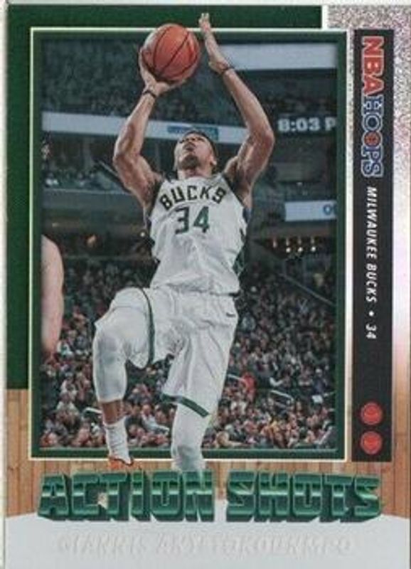 The Giannis Antetokounmpo 2019 Hoops #25 Action Shots card is 1 of 54 Giannis Antetokounmpo's card variations in the 2019 Hoops set being tracked by Sports Card Investor, including Base, Premium Box Set /199, Black Artist's Proof /1, Back Stage Pass, and Back Stage Pass - Blue.