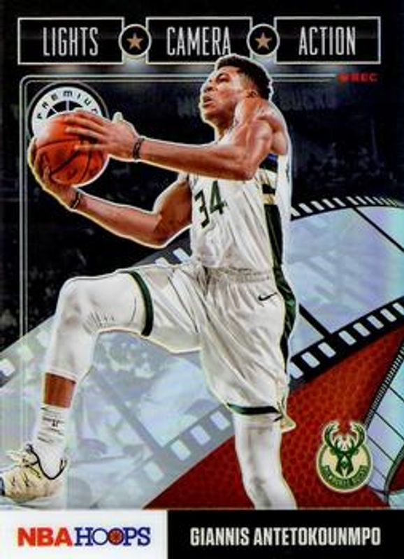 The Giannis Antetokounmpo 2019 Hoops #19 Lights Camera Action - Holo card is 1 of 54 Giannis Antetokounmpo's card variations in the 2019 Hoops set being tracked by Sports Card Investor, including Base, Premium Box Set /199, Black Artist's Proof /1, Action Shots, and Back Stage Pass.
