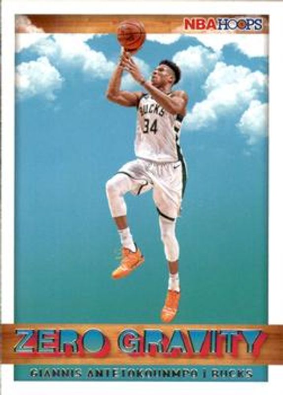 The Giannis Antetokounmpo 2019 Hoops #6 Zero Gravity card is 1 of 54 Giannis Antetokounmpo's card variations in the 2019 Hoops set being tracked by Sports Card Investor, including Base, Premium Box Set /199, Black Artist's Proof /1, Action Shots, and Back Stage Pass.