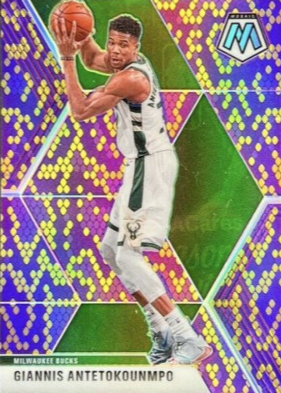 The Giannis Antetokounmpo 2019 Mosaic #75 Snakeskin Purple & Gold /20 card in Raw condition has not changed in price in the last 30 days and was last sold for $300.00 .