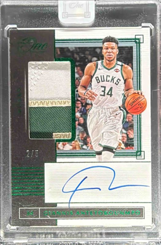 The Giannis Antetokounmpo 2019 One and One #JA-GAN Jersey Autographs - Green /5 card is 1 of 31 Giannis Antetokounmpo's card variations in the 2019 One and One set being tracked by Sports Card Investor, including Base /99, Blue /25, Purple /20, Red /15, and Gold /10.