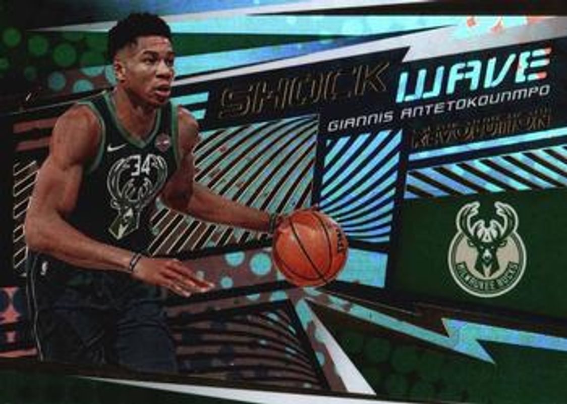 The Giannis Antetokounmpo 2019 Revolution #7 Shock - Wave card is 1 of 31 Giannis Antetokounmpo's card variations in the 2019 Revolution set being tracked by Sports Card Investor, including Base, Astro, Chinese New Year, Fractal, and Groove.