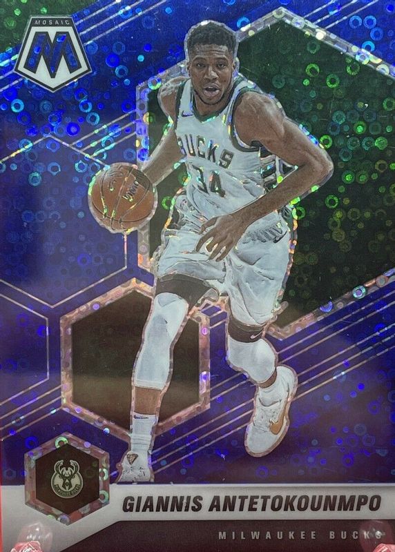 The Giannis Antetokounmpo 2020 Mosaic #80 Fast Break Blue /85 card in Raw condition has not changed in price in the last 30 days and was last sold for $4.25 .