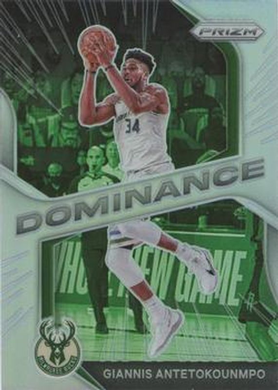 The Giannis Antetokounmpo 2020 Prizm #7 Dominance - Silver card is 1 of 100 Giannis Antetokounmpo's card variations in the 2020 Prizm set being tracked by Sports Card Investor, including Choice Blue Yellow Green, Fast Break, Green, Green Ice, and Hyper.