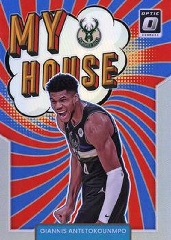 The Giannis Antetokounmpo 2021 Optic #4 My House - Holo card is 1 of 124 Giannis Antetokounmpo's card variations in the 2021 Optic set being tracked by Sports Card Investor, including Base, Blue Pulsar, Blue Velocity, Checkerboard, and Choice.