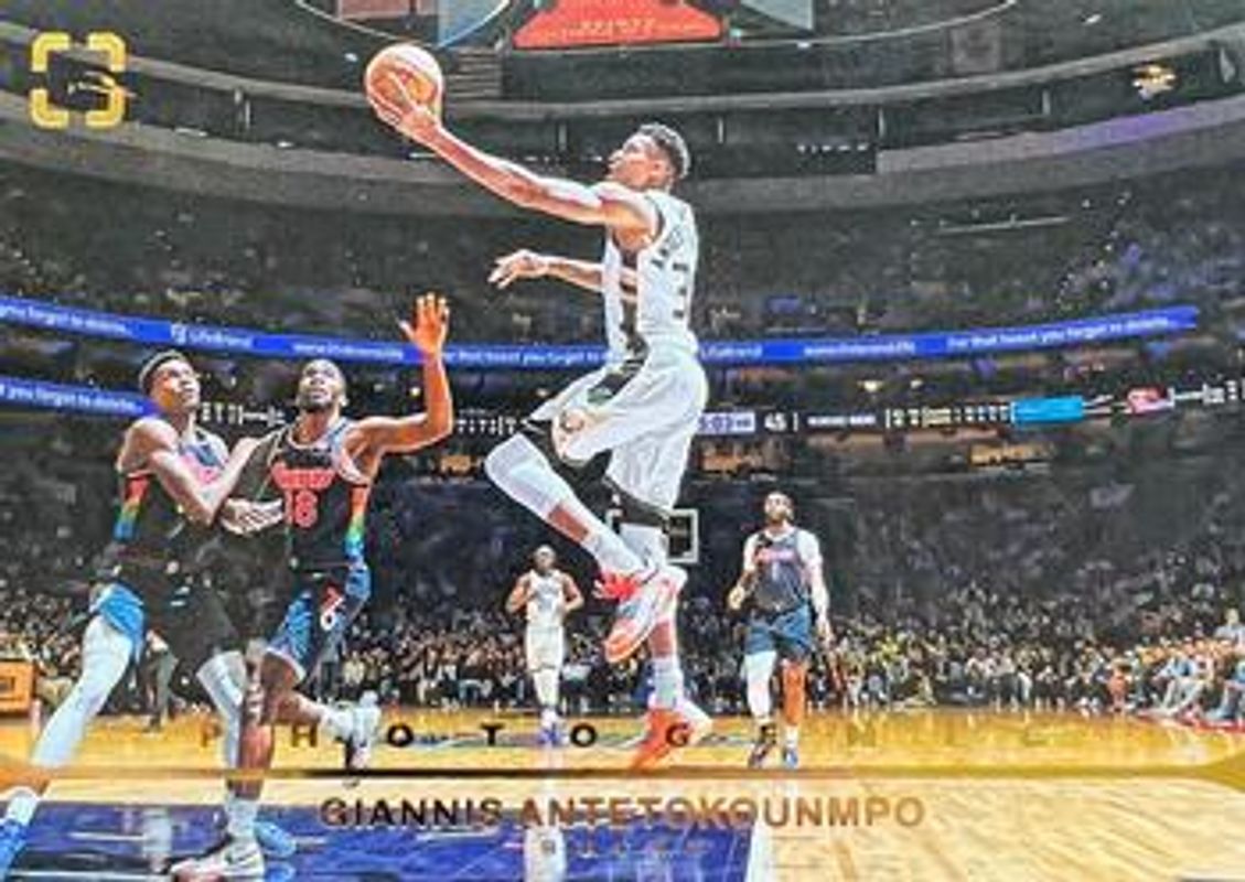 The Giannis Antetokounmpo 2021 Photogenic #21 Base card is 1 of 18 Giannis Antetokounmpo's card variations in the 2021 Photogenic set being tracked by Sports Card Investor, including Silver, Diamond Anniversary /75, Gold /10, Platinum /1, and Championship Feels.