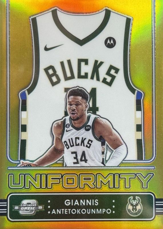 The Giannis Antetokounmpo 2022 Contenders Optic #8 Uniformity - Gold /10 card in Raw condition has not changed in price in the last 30 days and was last sold for $123.50 .