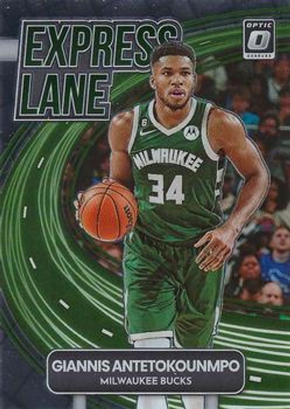 The Giannis Antetokounmpo 2022 Optic #10 Express Lane card is 1 of 109 Giannis Antetokounmpo's card variations in the 2022 Optic set being tracked by Sports Card Investor, including Base, Checkerboard, Choice Red & Green, Fast Break, and Green Shock.