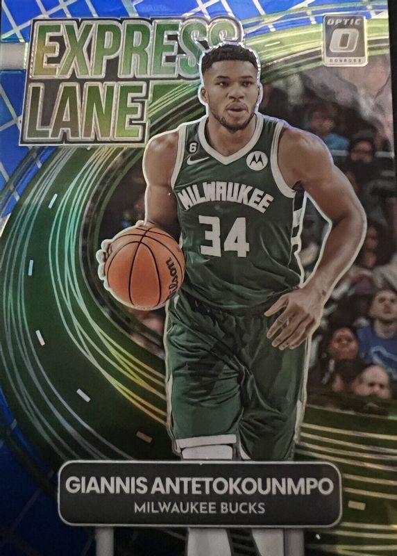 The Giannis Antetokounmpo 2022 Optic #10 Express Lane - Blue /85 card in Raw condition has not changed in price in the last 30 days and was last sold for $2.25 .