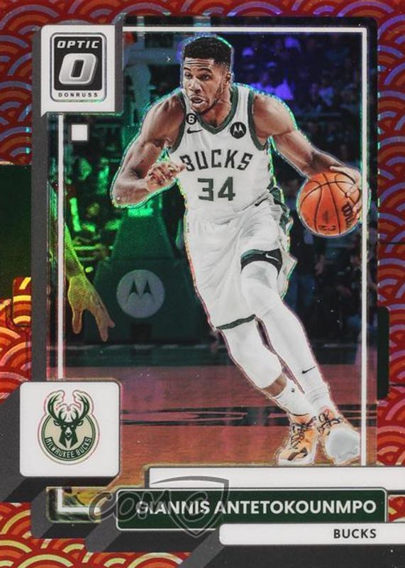 This card is 1 of 92 Giannis Antetokounmpo's card variations in the 2022 Optic set being tracked by Sports Card Investor, including Checkerboard, Choice Red & Green, Fast Break, Green Shock, and Holo.