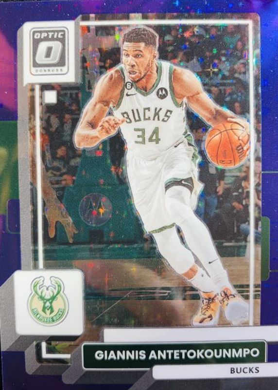 The Giannis Antetokounmpo 2022 Optic #75 Purple Stars FOTL /17 card in Raw condition has not changed in price in the last 30 days and was last sold for $34.63 .