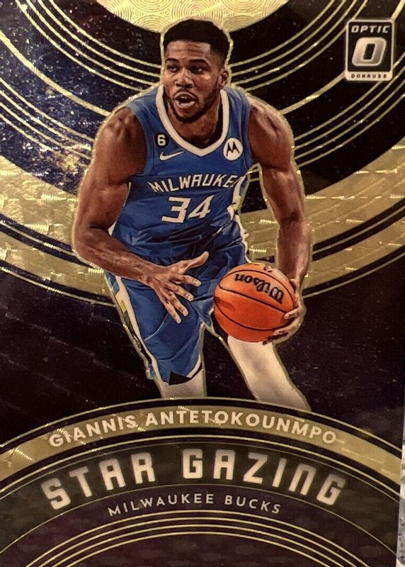 The Giannis Antetokounmpo 2022 Optic #1 Star Gazing - Gold Vinyl /1 card in Raw condition has not changed in price in the last 30 days and was last sold for $1,302.00 .