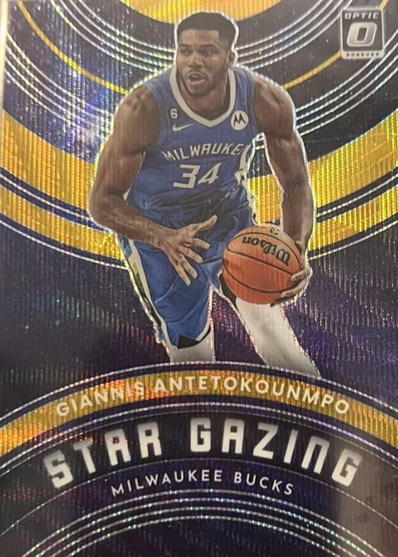 The Giannis Antetokounmpo 2022 Optic #1 Star Gazing - Gold Wave /10 card in Raw condition has not changed in price in the last 30 days and was last sold for $69.99 .
