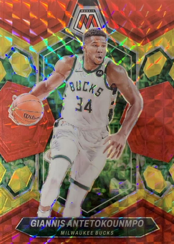 The Giannis Antetokounmpo 2023 Mosaic #77 Choice Fusion Red & Yellow /75 card in Raw condition has not changed in price in the last 30 days and was last sold for $8.50 .