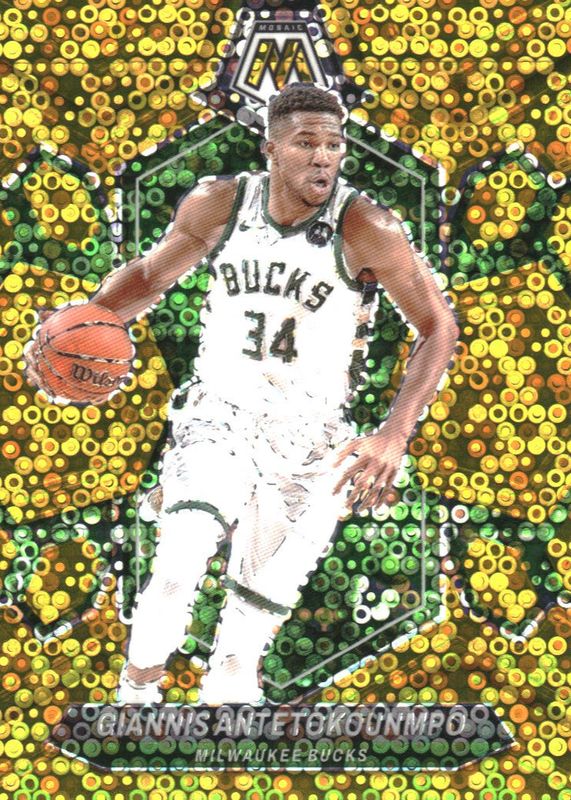 The Giannis Antetokounmpo 2023 Mosaic #77 Fast Break Gold /10 card in Raw condition has not changed in price in the last 30 days and was last sold for $85.00 .