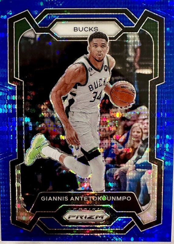 The Giannis Antetokounmpo 2023 Prizm #103 Blue Seismic /99 card in Raw condition has not changed in price in the last 30 days and was last sold for $10.00 .