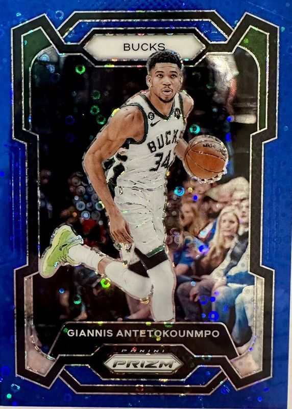 The Giannis Antetokounmpo 2023 Prizm #103 Fast Break Blue /150 card in Raw condition has not changed in price in the last 30 days and was last sold for $15.50 .