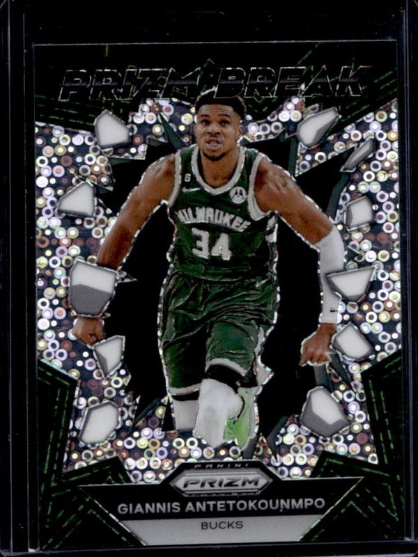 The Giannis Antetokounmpo 2023 Prizm #13 Prizm Break - Fast Break card is 1 of 103 Giannis Antetokounmpo's card variations in the 2023 Prizm set being tracked by Sports Card Investor, including Base, Blue Wave, Choice Blue Yellow Green, Fast Break, and Green.