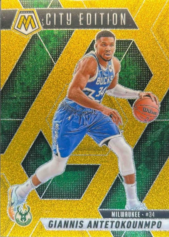 The Giannis Antetokounmpo 2024 Mosaic #282 City Edition - Gold Glitter /5 card in Raw condition has not changed in price in the last 30 days and was last sold for $102.50 .