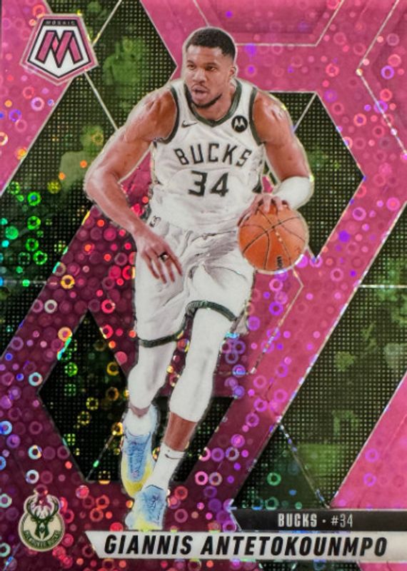 The Giannis Antetokounmpo 2024 Mosaic #13 Fast Break Pink /20 card in Raw condition has not changed in price in the last 30 days and was last sold for $75.00 .