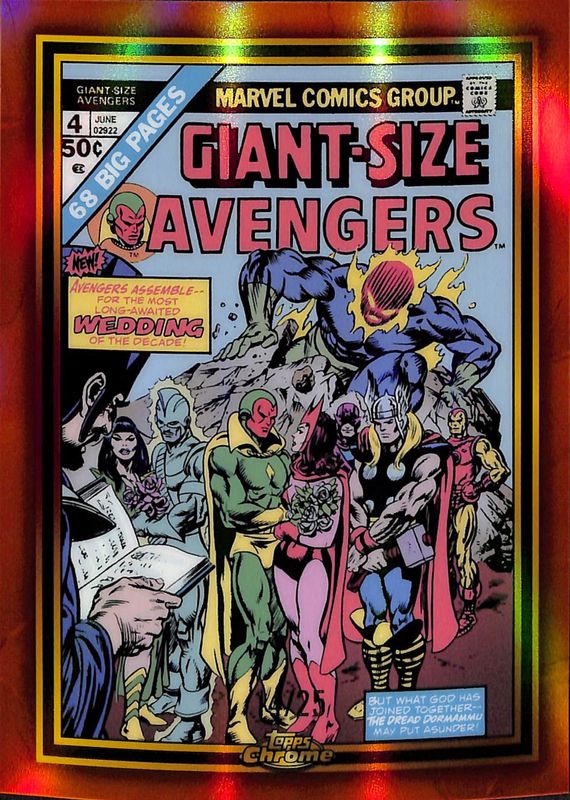 The Giant Size Avengers 4 2024 Topps Chrome #MGG-10 Marvel Giant Size 50th Anniversary Oversized Box Topper - Orange Refractor /25 card is 1 of 12 Giant Size Avengers 4's card variations in the 2024 Topps Chrome set being tracked by Sports Card Investor, including Marvel Giant Size 50th Anniversary Oversized Box Topper, Marvel Giant Sized 50th Anniversary, Marvel Giant Size 50th Anniversary Oversized Box Topper - Gold Refractor /50, Marvel Giant Sized 50th Anniversary - Gold Refractor /50, and Marvel Giant Sized 50th Anniversary - Orange Refractor /25.