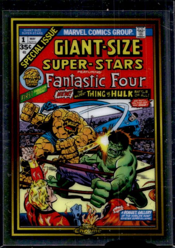 The Giant Size Super-stars 1 2024 Topps Chrome #MG-1 Marvel Giant Sized 50th Anniversary card is 1 of 12 Giant Size Super-stars 1's card variations in the 2024 Topps Chrome set being tracked by Sports Card Investor, including Marvel Giant Size 50th Anniversary Oversized Box Topper, Marvel Giant Size 50th Anniversary Oversized Box Topper - Gold Refractor /50, Marvel Giant Sized 50th Anniversary - Gold Refractor /50, Marvel Giant Size 50th Anniversary Oversized Box Topper - Orange Refractor /25, and Marvel Giant Sized 50th Anniversary - Orange Refractor /25.