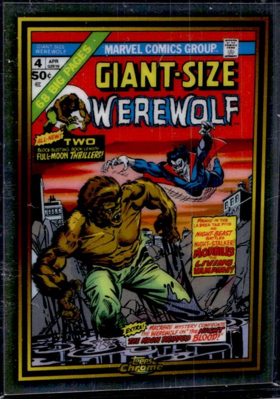 The Giant Size Werewolf by Night 4 2024 Topps Chrome #MG-8 Marvel Giant Sized 50th Anniversary card is 1 of 12 Giant Size Werewolf by Night 4's card variations in the 2024 Topps Chrome set being tracked by Sports Card Investor, including Marvel Giant Size 50th Anniversary Oversized Box Topper, Marvel Giant Size 50th Anniversary Oversized Box Topper - Gold Refractor /50, Marvel Giant Sized 50th Anniversary - Gold Refractor /50, Marvel Giant Size 50th Anniversary Oversized Box Topper - Orange Refractor /25, and Marvel Giant Sized 50th Anniversary - Orange Refractor /25.