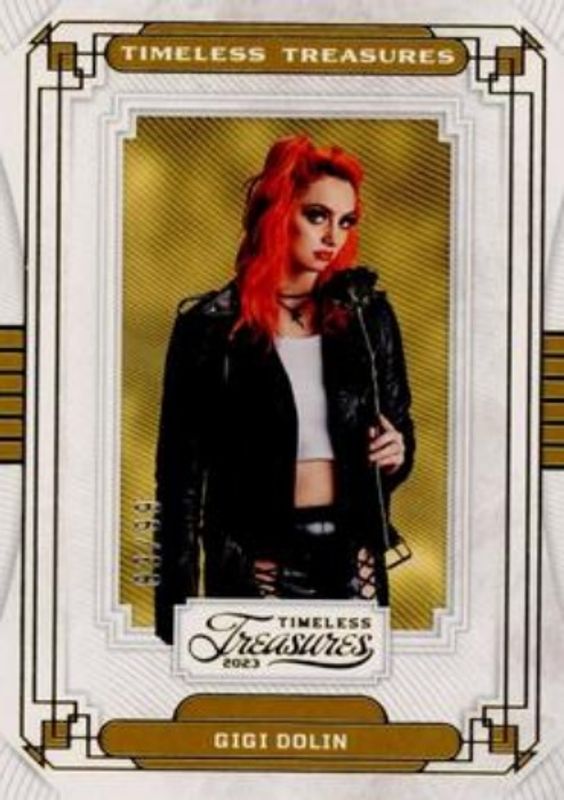 The Gigi Dolin 2023 Chronicles WWE #TT-3 Timeless Treasures /99 card is 1 of 55 Gigi Dolin's card variations in the 2023 Chronicles WWE set being tracked by Sports Card Investor, including #136 Base, #39 Base, #308 Base, #114 Base, and #278 Base.