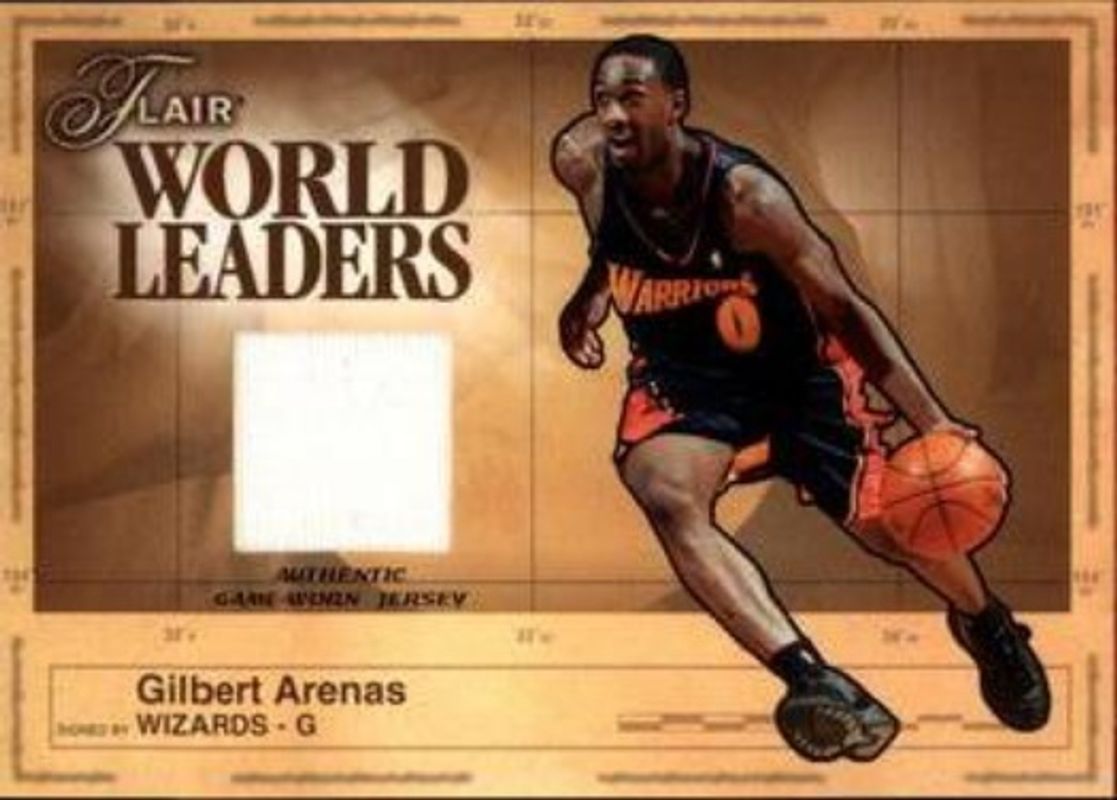 The Gilbert Arenas 2003 Flair #WL-GA World Leaders Game Used card is 1 of 5 Gilbert Arenas' card variations in the 2003 Flair set being tracked by Sports Card Investor, including Base /500, Row 1 /100, Row 2 /1, and World Leaders.