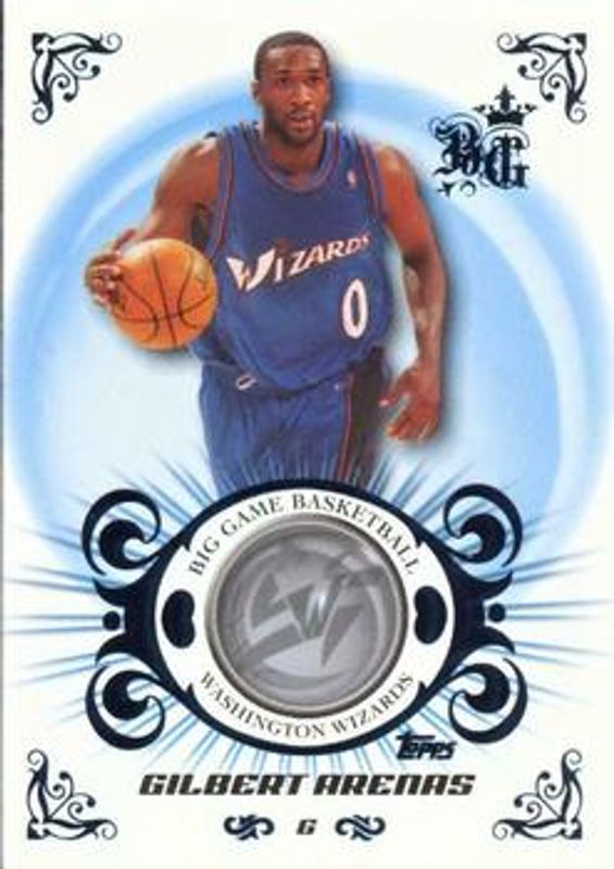 The Gilbert Arenas 2006 Topps Big Game #6 Blue /59 card is 1 of 5 Gilbert Arenas' card variations in the 2006 Topps Big Game set being tracked by Sports Card Investor, including Base /579, Red /129, Gold /1, and All Star Rally Relics Dual /15.