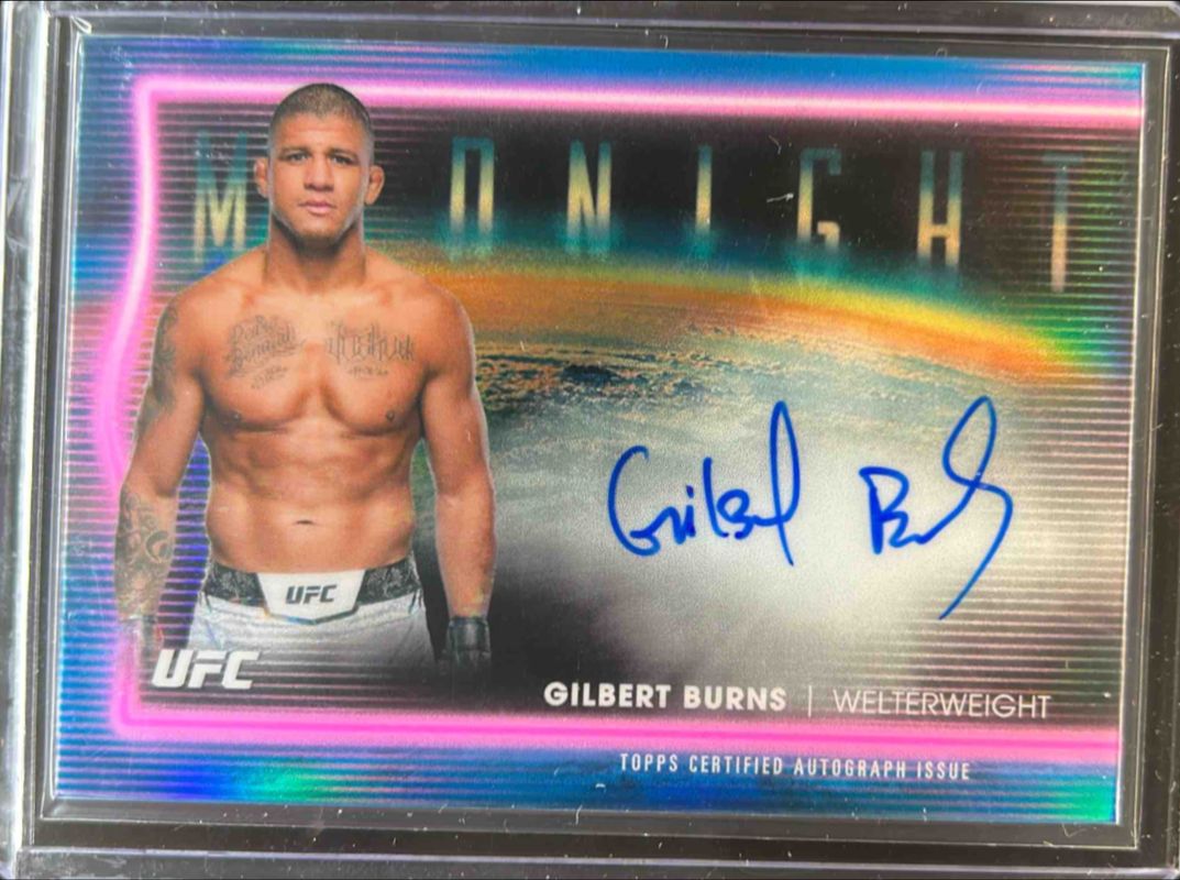 The Gilbert Burns 2025 Topps Midnight UFC #HNS-GB Horizon Signatures card is 1 of 15 Gilbert Burns' card variations in the 2025 Topps Midnight UFC set being tracked by Sports Card Investor, including Horizon Signatures - Moon Beam, Insomnia, Insomnia - Moon Beam, Horizon Signatures - Twilight /99, and Horizon Signatures - Dusk /75.