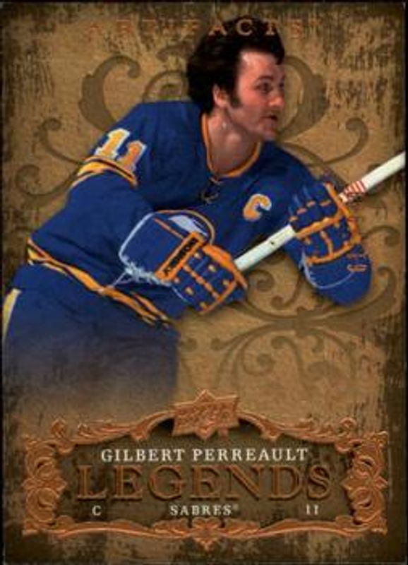 The Gilbert Perreault 2008 Upper Deck Artifacts #142 Base /999 card is 1 of 27 Gilbert Perreault's card variations in the 2008 Upper Deck Artifacts set being tracked by Sports Card Investor, including #90 Base /999, #142 Gold /75, #142 Blue /50, #90 Blue /50, and #142 Copper Spectrum /25.