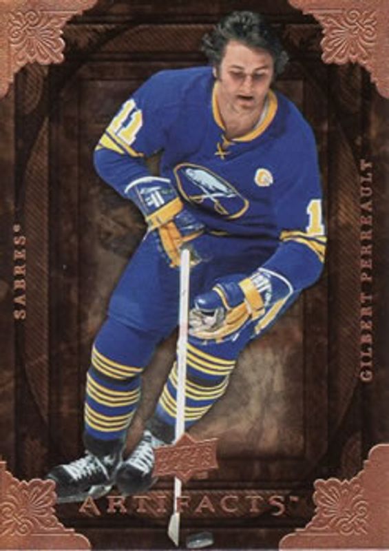 The Gilbert Perreault 2008 Upper Deck Artifacts #90 Base /999 card is 1 of 27 Gilbert Perreault's card variations in the 2008 Upper Deck Artifacts set being tracked by Sports Card Investor, including #142 Base /999, #142 Gold /75, #142 Blue /50, #90 Blue /50, and #142 Copper Spectrum /25.
