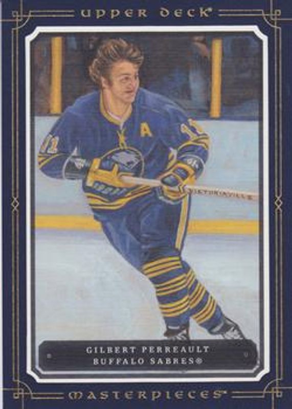 The Gilbert Perreault 2008 Upper Deck Masterpieces #XL-GP 5 x 7 card is 1 of 17 Gilbert Perreault's card variations in the 2008 Upper Deck Masterpieces set being tracked by Sports Card Investor, including Base, Brown, Green /99, Blue /50, and Red /25.