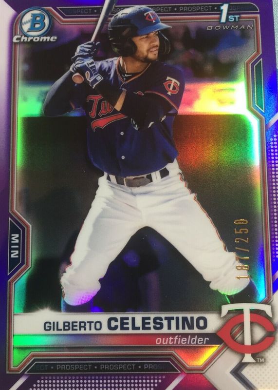 The Gilberto Celestino 2021 Bowman Chrome #BCP-232 Prospects - Purple Refractor /250 (1st) Rookie card in Raw condition has not changed in price in the last 30 days and was last sold for $3.99 .