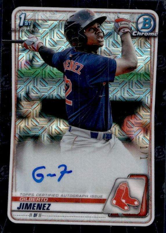 This card is 1 of 18 Gilberto Jimenez's card variations in the 2020 Bowman Chrome set being tracked by Sports Card Investor, including Prospect Auto (1st), Prospect Auto - Refractor /499 (1st), Prospect Auto - Purple Refractor /250 (1st), Prospect Auto - Blue Refractor /150 (1st), and Prospect Auto - Choice Refractor /150 (1st).