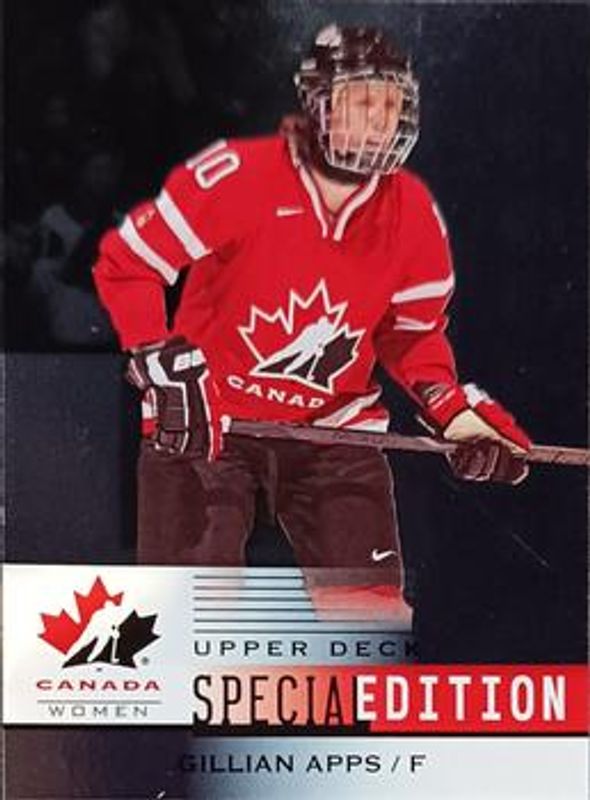 The Gillian Apps 2014 Upper Deck Team Canada Juniors #SE-53 Special Edition card is 1 of 23 Gillian Apps' card variations in the 2014 Upper Deck Team Canada Juniors set being tracked by Sports Card Investor, including #69 Base, #146 Base, #146 Gold Sepia, #69 Gold Sepia, and #146 Exclusives /99.