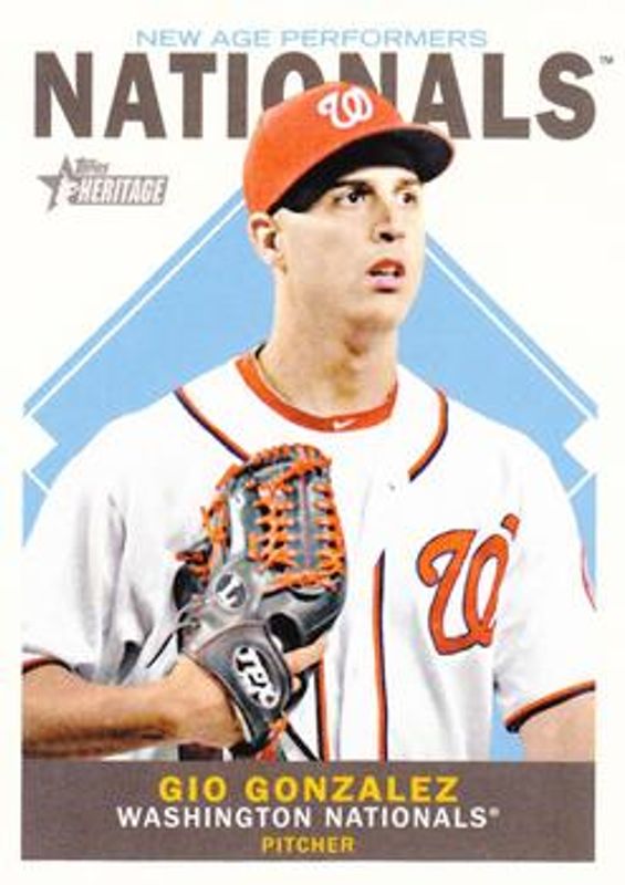 The Gio Gonzalez 2013 Topps Heritage #NAP-GG New Age Performers card is 1 of 11 Gio Gonzalez's card variations in the 2013 Topps Heritage set being tracked by Sports Card Investor, including Base, Black, Red Border, Venezuelan, and Mini /100.