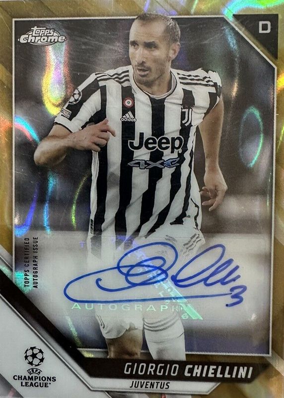 The Giorgio Chiellini 2021 Topps Chrome UEFA Champions League #CA-GC Autographs - Gold Lava Refractor card in Raw condition has not changed in price in the last 30 days and was last sold for $19.50 .