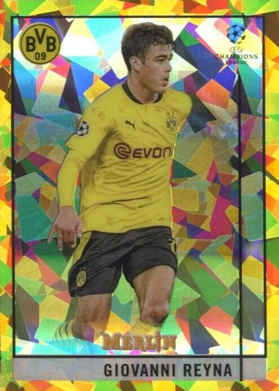 This card is 1 of 17 Giovanni Reyna's card variations in the 2020 Topps Merlin Chrome UEFA Champions League set being tracked by Sports Card Investor, including Aqua Prism Refractor, Refractor, Purple Refractor /299, Atomic Refractor /250, and Aqua Refractor /199.