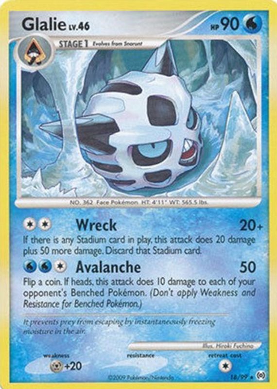The Glalie 2009 Platinum: Arceus #18/99 Base card in Raw TCG (Lightly Played) condition has not changed in price in the last 30 days and was last sold for $3.36 .