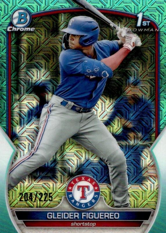 This card is 1 of 12 Gleider Figuereo's card variations in the 2023 Bowman Mega Box set being tracked by Sports Card Investor, including Chrome Prospects (1st), Chrome Prospects - Purple Mojo Refractor /250 (1st), Chrome Prospects - Pink Mojo Refractor /199 (1st), Chrome Prospects - Navy Mojo Refractor /175 (1st), and Chrome Prospects - Blue Mojo Refractor /150 (1st).
