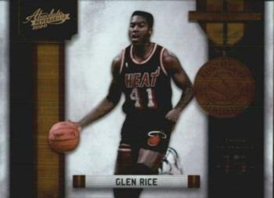 The Glen Rice 2010 Absolute Memorabilia #6 Absolute Heroes /399 card is 1 of 8 Glen Rice's card variations in the 2010 Absolute Memorabilia set being tracked by Sports Card Investor, including Absolute Heroes Spectrum /100, Absolute Heroes - Materials /25, Absolute Patches Jumbo Prime Spectrum /25, Absolute Heroes Materials - Prime /10, and Absolute Heroes Materials Prime Signatures /5.