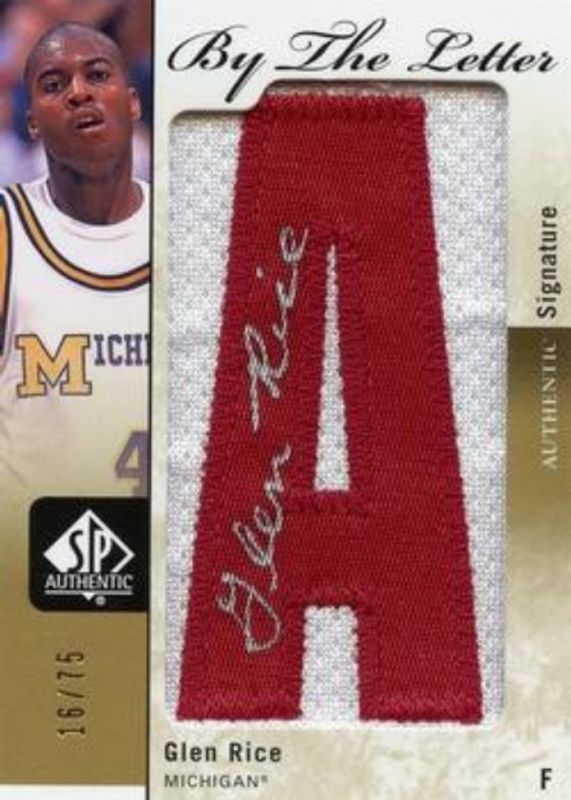 The Glen Rice 2011 SP Authentic #BL-GRg By the Letter /75 card is 1 of 13 Glen Rice's card variations in the 2011 SP Authentic set being tracked by Sports Card Investor, including #67 Base, #HC-GR Home Court Signatures, #BL-GRb By the Letter /75, #BL-GRc By the Letter /75, and #BL-GRd By the Letter /75.