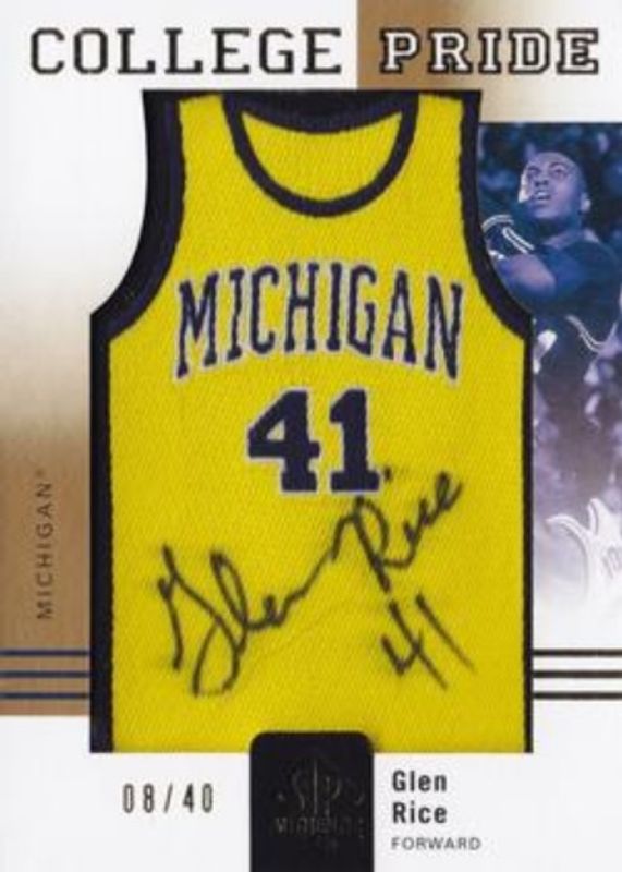 The Glen Rice 2011 SP Authentic #CJ-GR College Pride Autographs /40 card is 1 of 13 Glen Rice's card variations in the 2011 SP Authentic set being tracked by Sports Card Investor, including #67 Base, #HC-GR Home Court Signatures, #BL-GRb By the Letter /75, #BL-GRc By the Letter /75, and #BL-GRd By the Letter /75.