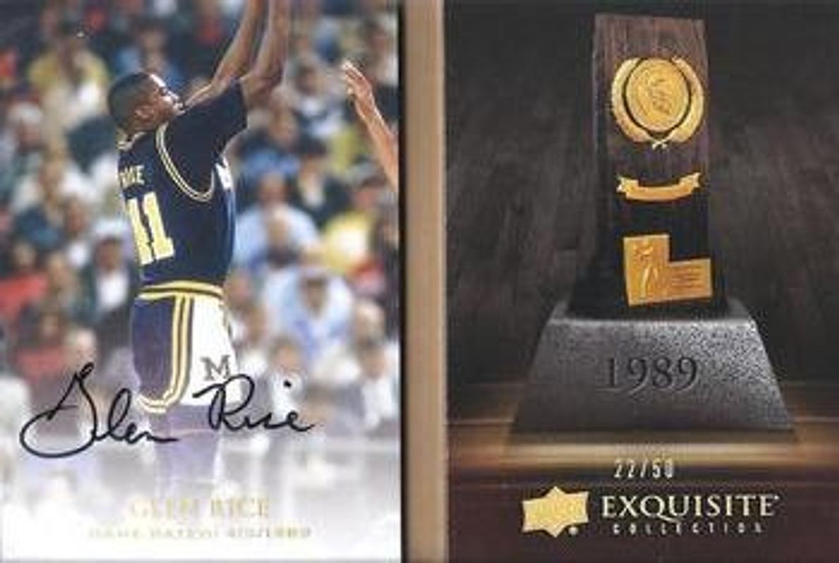 The Glen Rice 2012 Upper Deck Exquisite Collection #CT-GR National Championship Trophy Autographs /15 card is 1 of 7 Glen Rice's card variations in the 2012 Upper Deck Exquisite Collection set being tracked by Sports Card Investor, including Base /99, Gold Masterpiece Autographs /1, Collegiate Seal Autographs /99, Dream Seasons Autographs /70, and Limited Logo Autographs /10.