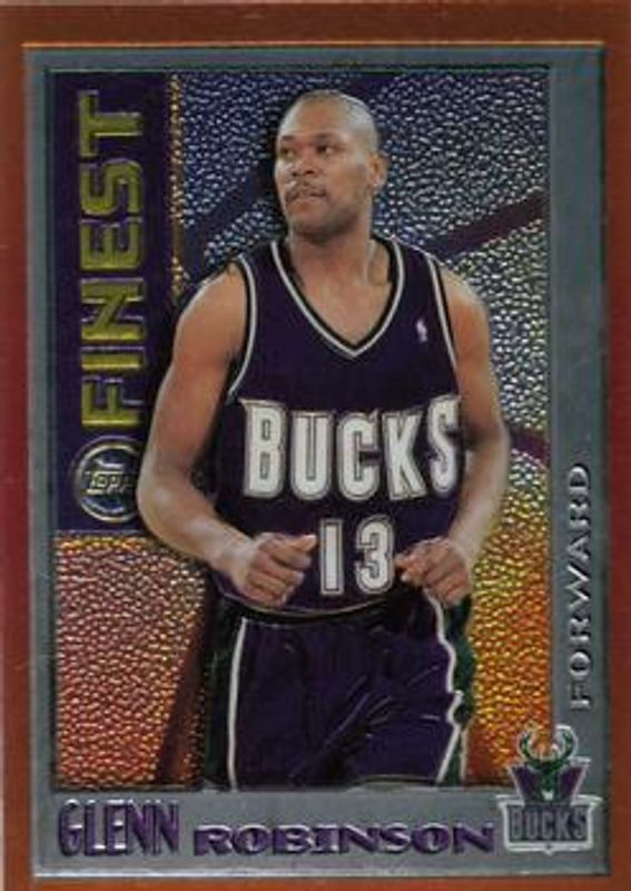 The Glenn Robinson 1995 Topps Finest #M10 Mystery card is 1 of 6 Glenn Robinson's card variations in the 1995 Topps Finest set being tracked by Sports Card Investor, including Base, Refractor, Dish and Swish, Mystery - Borderless Gold Refractor, and Mystery - Borderless Silver.