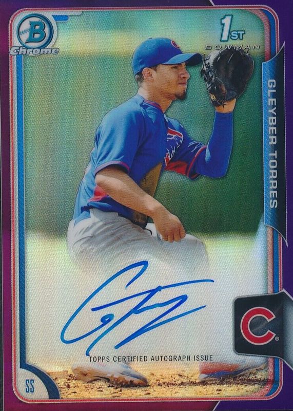 Gleyber Torres' Baseball cards are available in at least 125 sets. Gleyber Torres' biggest 7-day price movers are 2018 Topps Update #US200 Base, 2015 Bowman Chrome #BCAP-GT Prospect Auto - Purple Refractor /250 (1st), and 2015 Bowman Chrome #BCAP-GT Prospect Auto (1st).